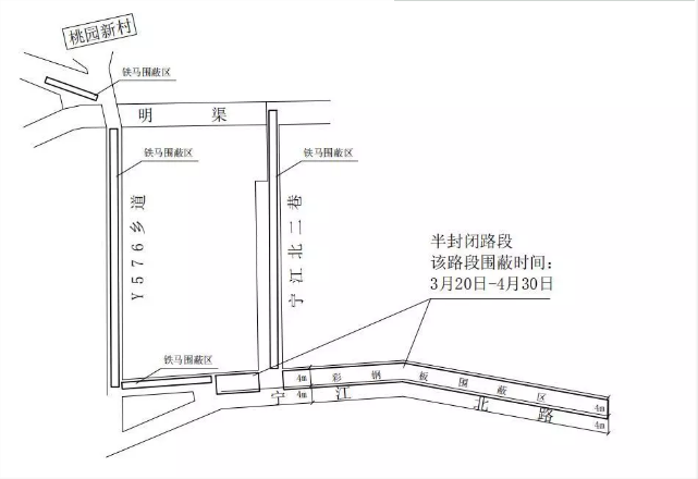 1、宁江北路至Y576线桃源新村门口进行半封闭施工,封闭时间为2019年3月20日至4月30日。